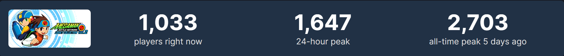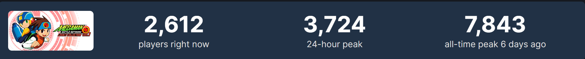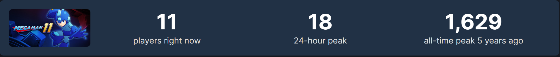 이건 스팀판 동접자 수를 기록한 이미지인데요. 1,2,3 가 수록된 vol.1과 4,5,6이 수록된 vol.2 동접자가 따로 기록되어 있습니다. 둘을 합치면 최고 동접자 수가 1만 명에 육박하는데요. 다른 대작 게임들과 비교하면 초라한 수치라고 느낄 수도 있습니다만, 록맨으로 한정하면 어마어마하게 높은 수치입니다!