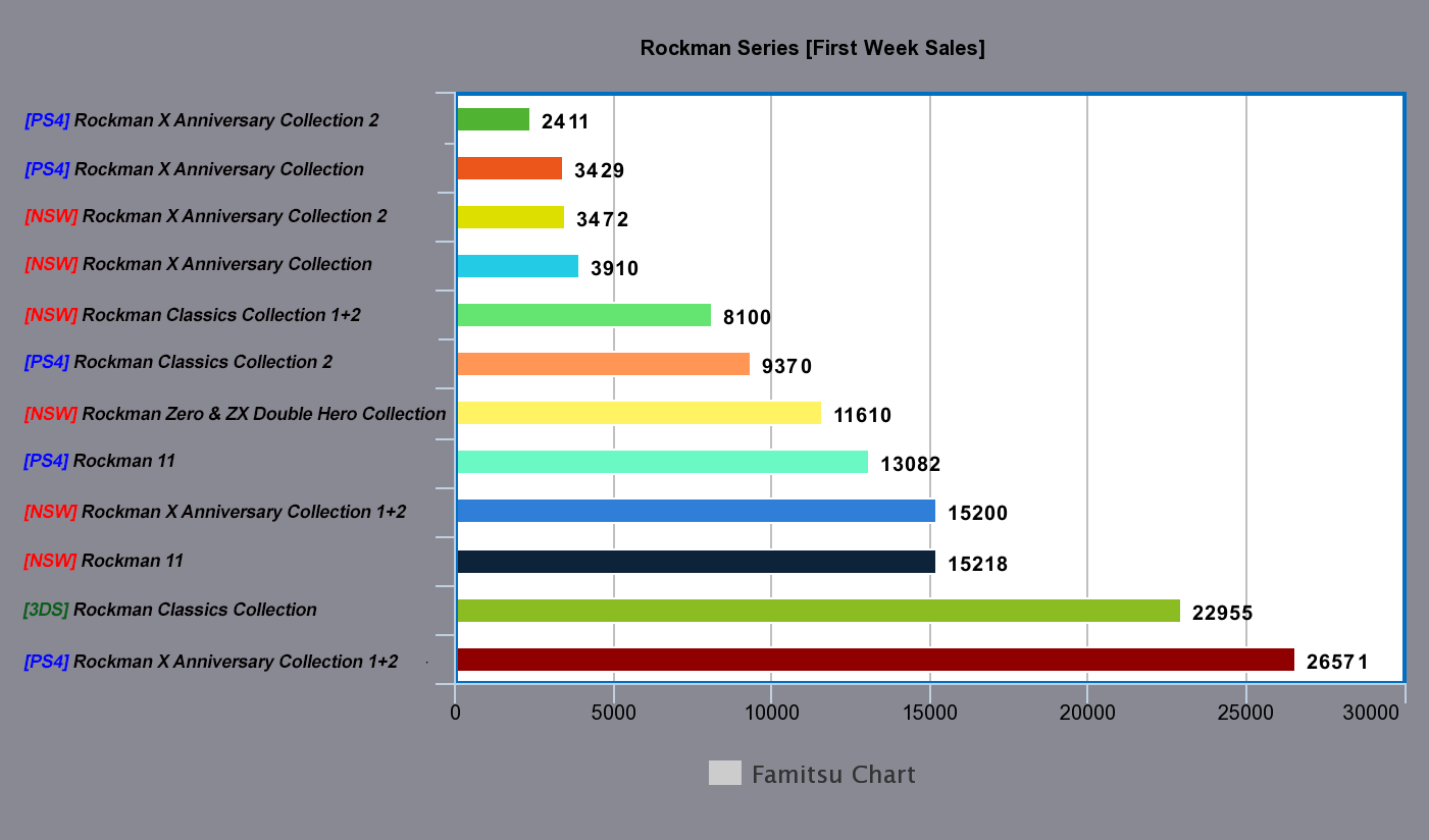 패미통에서 집계한 주간 판매량입니다. 록맨 에그제 어드밴스드 컬렉션 스위치판이 1위, PS4판이 5위로 합계 60,246장을 기록했네요! 패미통 주간 판매량 집계는 패키지 판매량만 취합하기 때문에, 다운로드판까지 포함하면 아마도 7만장 이상의 판매량을 기록하지 않았을까 싶습니다.