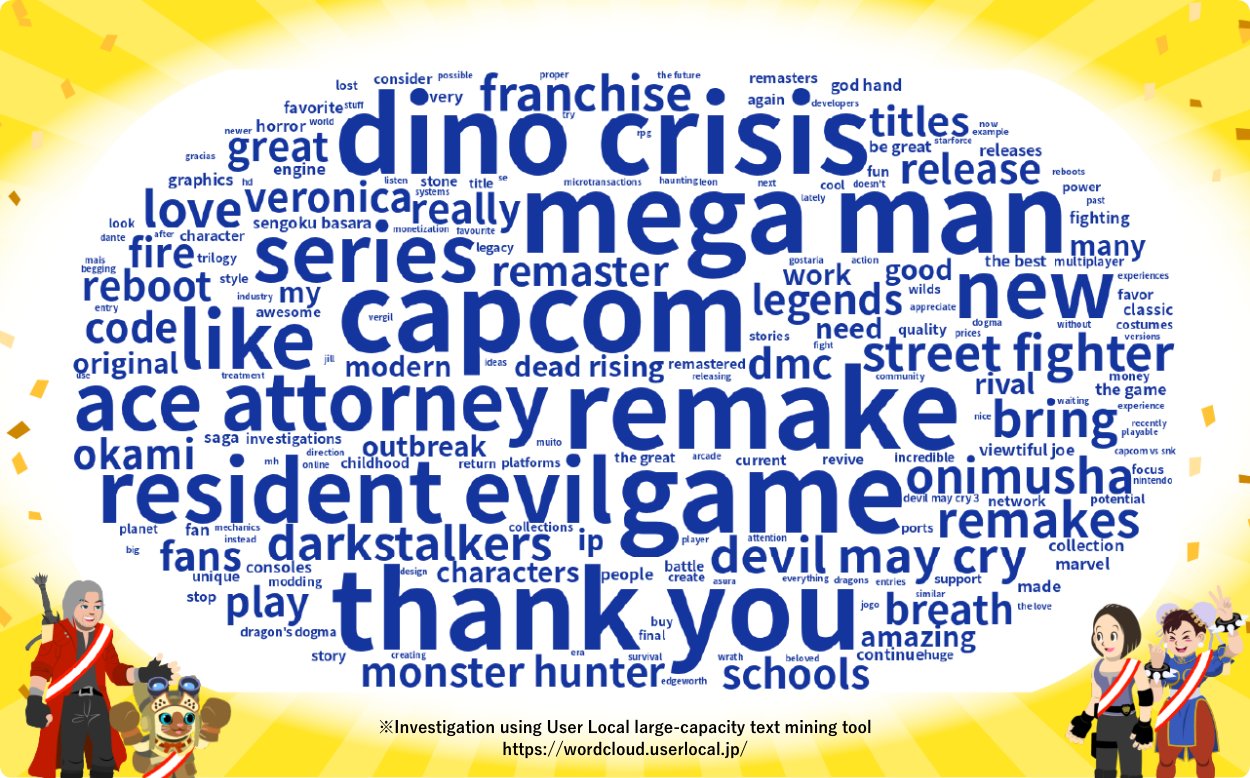 투표 마감은 4월 12일인데, 맛뵈기(?)로 인기 있는 키워드가 먼저 공개되었습니다. 록맨이 가장 큰 글자 크기로 가운데를 차지하고 있네요! 😁 제 예상대로 후속편을 원하는 작품 설문에서 1~2위를 차지한 게 아닌가 싶습니다. 록맨 이외에 크게 자리 잡은 타이틀들은 전국 바사라, 브레스 오브 파이어, 저스티스 학원 등, 주로 오래도록 속편을 보지 못한 게임들이네요. 사람 심리가 다 거기서 거기인 듯합니다. 바하, 스파, 몬헌 등은 뭐 투표로 지지해주지 않아도 캡콤이 알아서 내줄 게임들이니까요 ㅎㅎ
