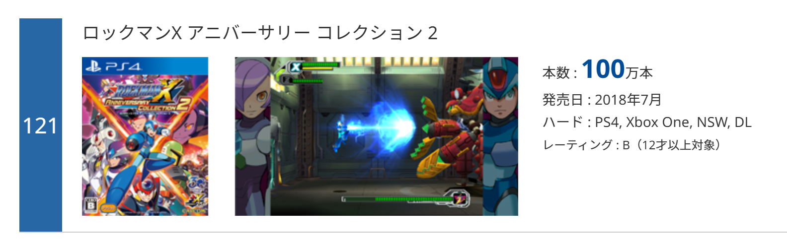 이제 록맨 시리즈 밀리언셀러는 록맨11 (190만), 록맨 클래식 컬렉션 (160만), 록맨2 (151만), 록맨 에그제4 (135만), 록맨X 애니버서리 컬렉션 (130만), 록맨X (116만), 록맨3 (108만), 록맨X 애니버서리 컬렉션2 (100만) 총 8작품이 되었네요. 앞으로 클래식 컬렉션2, 에그제 컬렉션등이 등재되면 10작품 이상도 가능할 거 같습니다 ㅎㅎ