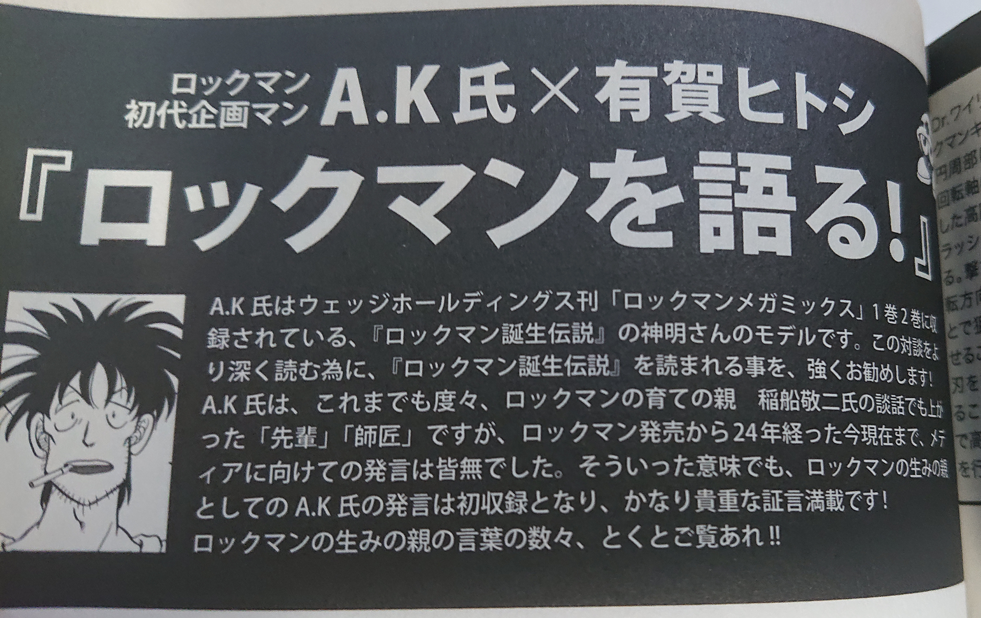 대개 어떤 게임의 아버지, 창조자라고 하면 그 게임의 디렉터, 메인기획자를 칭하는 경우가 많은데요. 슈퍼 마리오의 기획자였던 미야모토 시게루나, 메탈기어 솔리드의 기획자인 코지마 히데오처럼, 록맨에는 A.K 가 있었다고 보시면 되겠습니다. 하지만 A.K는 캡콤의 주축 중 하나인 록맨을 탄생시킨 개발자인데도 불구하고 거의 조명되지 않은 편인데요.
