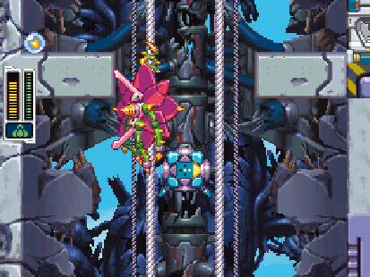 야베 : GBA에선 배경 레이어를 4장밖에 쓸 수 없었기 때문에, 라이프 게이지 라든가 UI 표시로 배경을 1장, 보스로 1장 쓰면 남은 2장으로 배경을 표현하지 않으면 안 되었습니다. 그러면 발판과 배경 밖에 표시할 수 없었죠. 그러던 것이 닌텐도DS로 바뀌고, 거대한 보스를 내면서 배경과 기믹을 표현할 수 있는 폭이 생겼습니다.