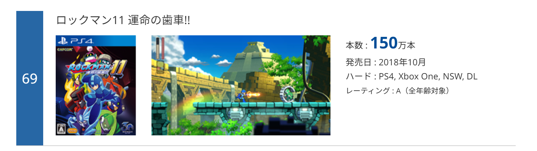 이번 캡콤 밀리언셀러 타이틀 판매량 데이터가 업뎃되면서, 록맨11의 판매량이 140->150만으로 갱신되었습니다! 록맨2와의 차이는 단 1만장! 이게 3월까지 데이터고, 10만장 단위로 업데이트되는 걸 생각해보면, 이미 록맨11의 판매량은 록맨2를 추월했을지도 모릅니다 ㅎㅎ